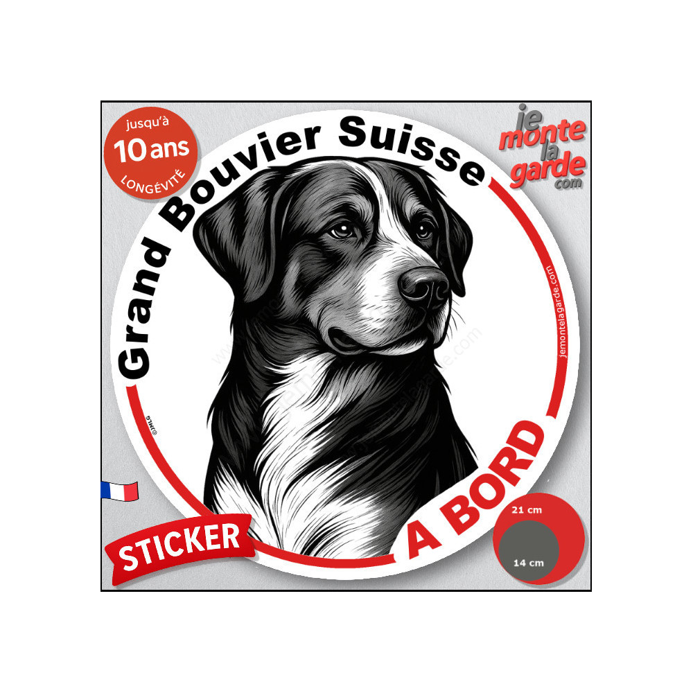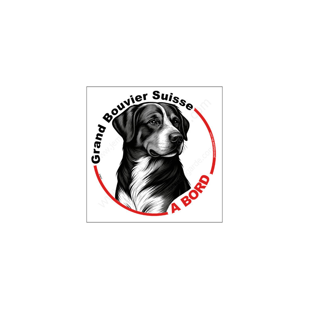 Un disque autocollant rond, disponible en 2 tailles, à coller à l'arrière de votre voiture pour prévenir de la présence de votre Grand Bouvier Suisse.