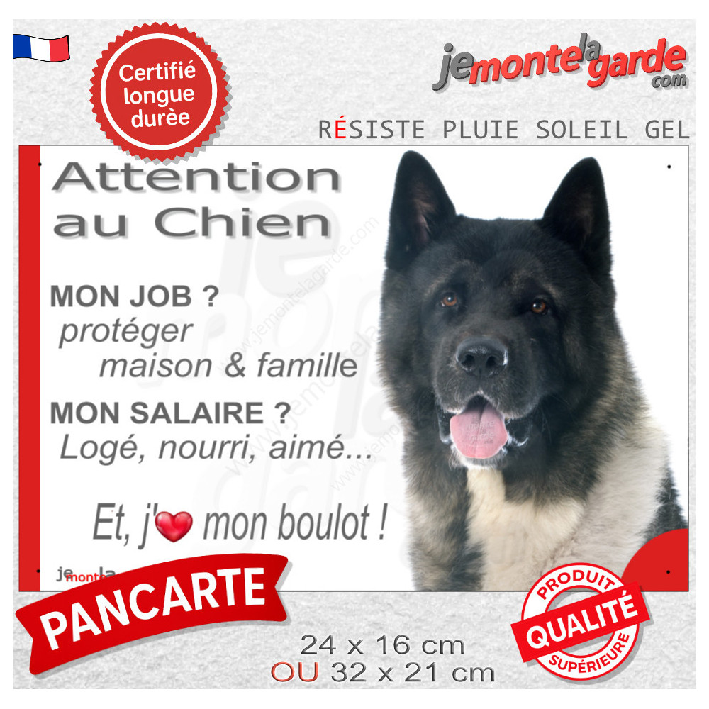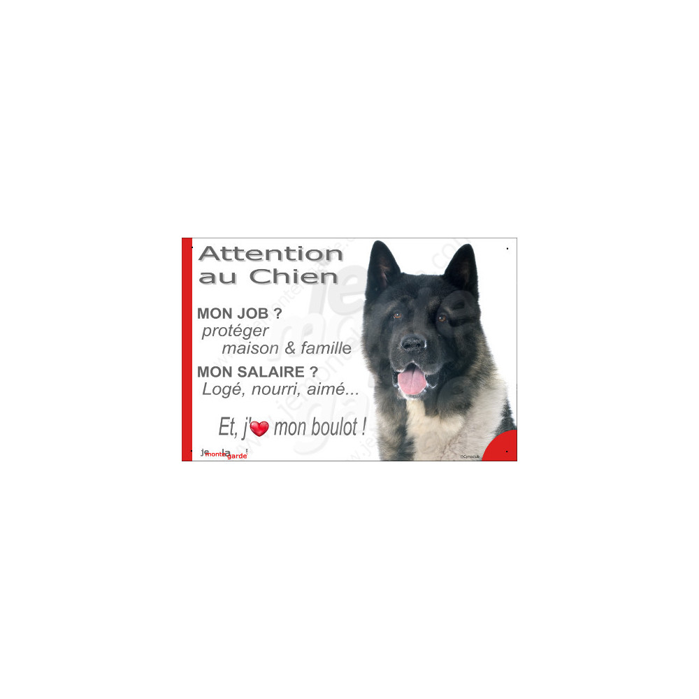 Pour avertir les visiteurs, et les importuns… le mieux, c'est de laisser faire le chien, avec cette pancarte "Attention au Chien, mon Job ?, Mon Salaire ? J'aime mon Boulot !" d'expliquer son métier, avec ce texte amusant et informatif illustré de la photographie d'un Akita Américain bringé sombre avec masque noir.