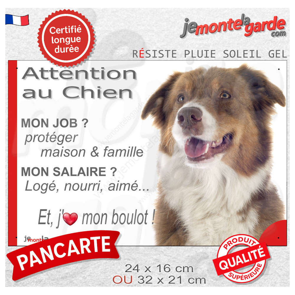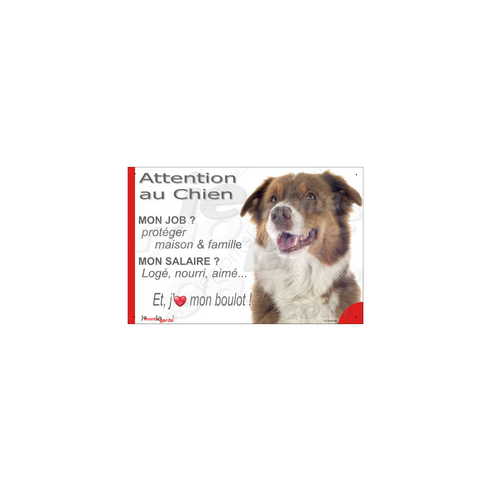 Pour bien avertir les visiteurs, et les importuns… le mieux, c'est de laisser faire le chien avec cette pancarte "Attention au Chien, mon Job ?, Mon Salaire ? J'aime mon Boulot !" d'expliquer son métier, avec ce texte amusant et très informatif illustré de la photographie d'un Berger Australien tricolore rouge.