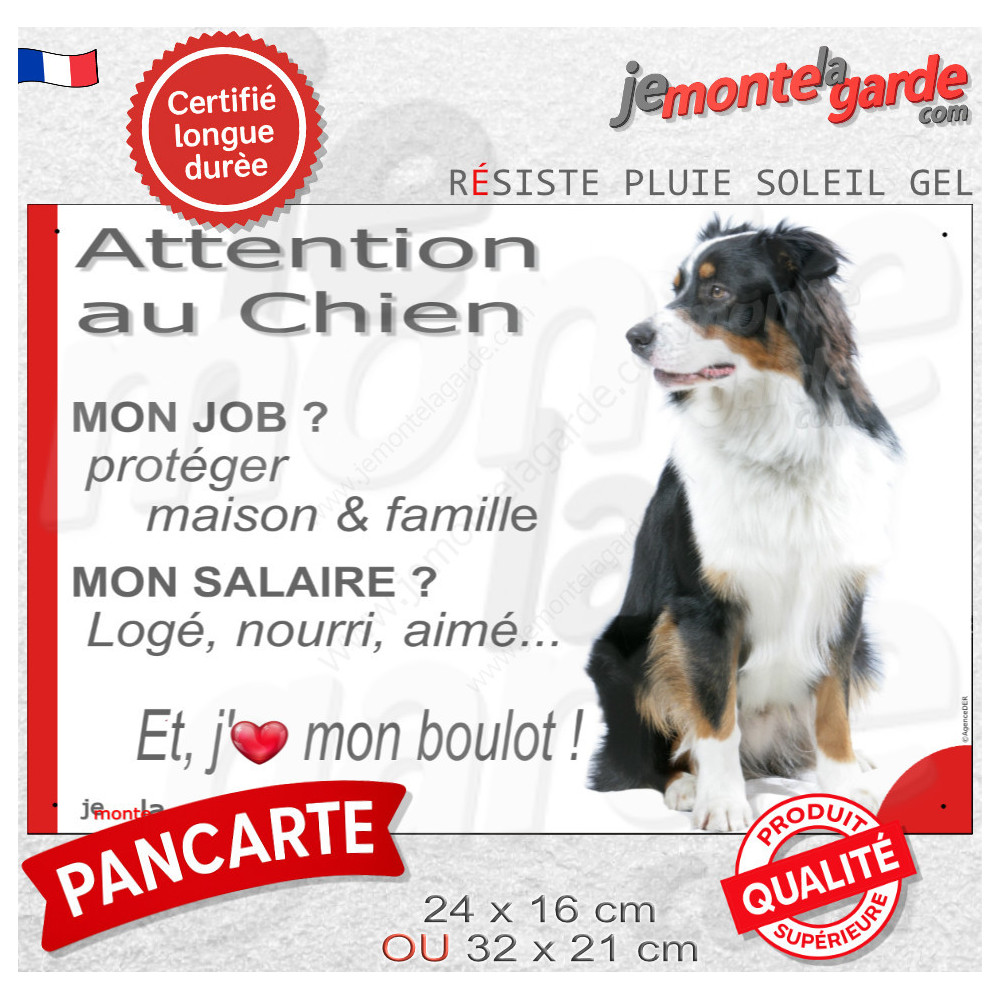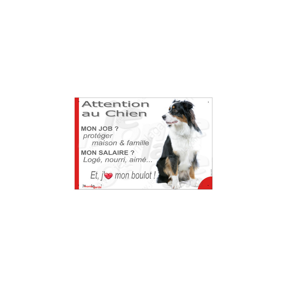Pour bien avertir les visiteurs, et les importuns… le mieux, c'est de laisser faire le chien avec cette pancarte "Attention au Chien, mon Job ?, Mon Salaire ? J'aime mon Boulot !" d'expliquer son métier, avec ce texte amusant et très informatif illustré de la photographie d'un Berger Australien tricolore noir.