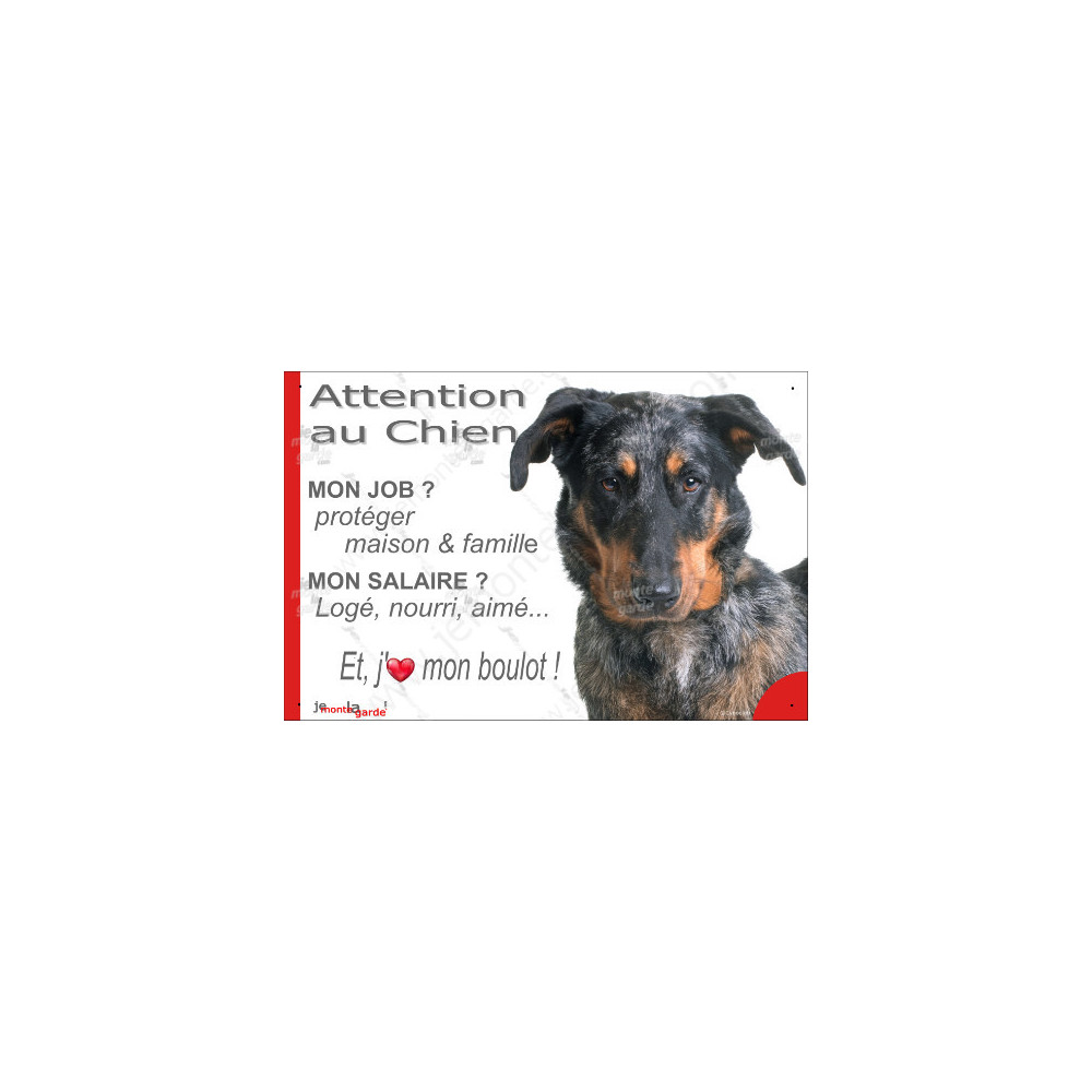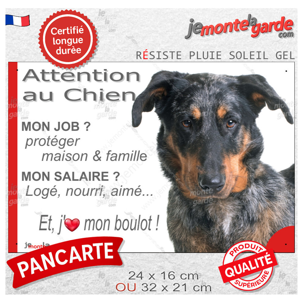Des fois, pour bien avertir les visiteurs, et les importuns… le mieux, c'est de laisser faire le chien avec cette pancarte "Attention au Chien, mon Job ?, Mon Salaire ? J'aime mon Boulot !" d'expliquer son métier, avec ce texte amusant et très informatif illustré de la photographie d'un Berger de Beauce arlequin.