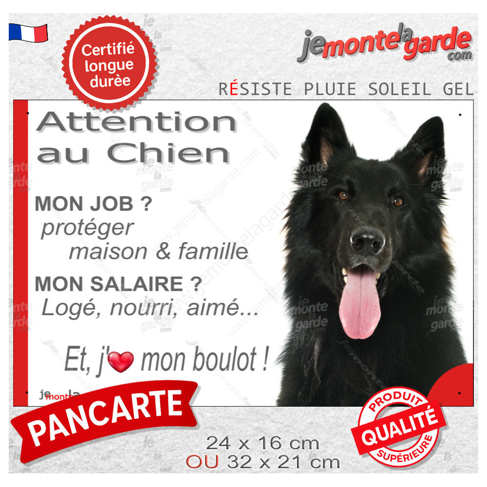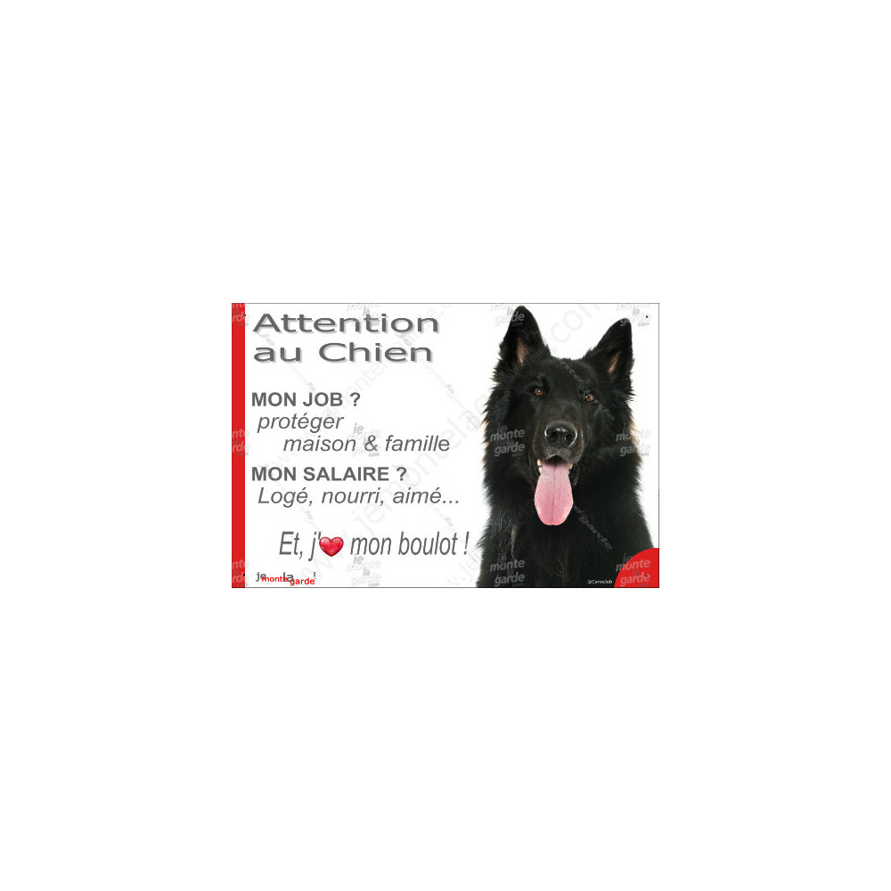 Des fois, pour bien avertir les visiteurs, et les importuns… le mieux, c'est de laisser faire le chien avec cette pancarte "Attention au Chien, mon Job ?, Mon Salaire ? J'aime mon Boulot !" d'expliquer son métier, avec ce texte amusant et très informatif illustré de la photographie d'un Berger Belge Groenendael.