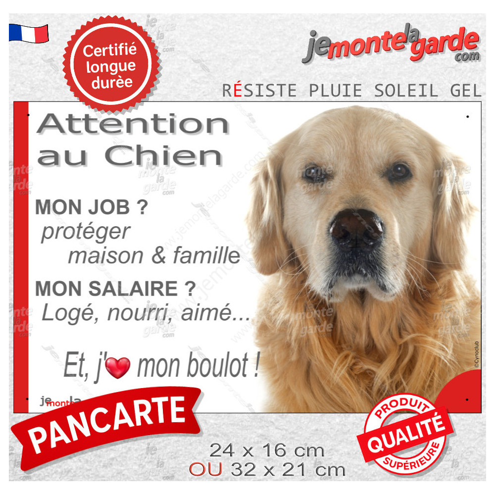 Des fois, pour bien avertir les visiteurs, et les importuns… le mieux, c'est de laisser faire le chien avec cette pancarte "Attention au Chien, mon Job ?, Mon Salaire ? J'aime mon Boulot !" d'expliquer son métier, avec ce texte amusant et très informatif illustré de la photographie d'un Golden Retriever