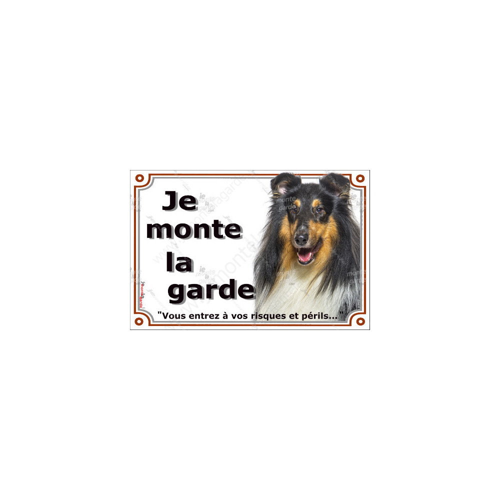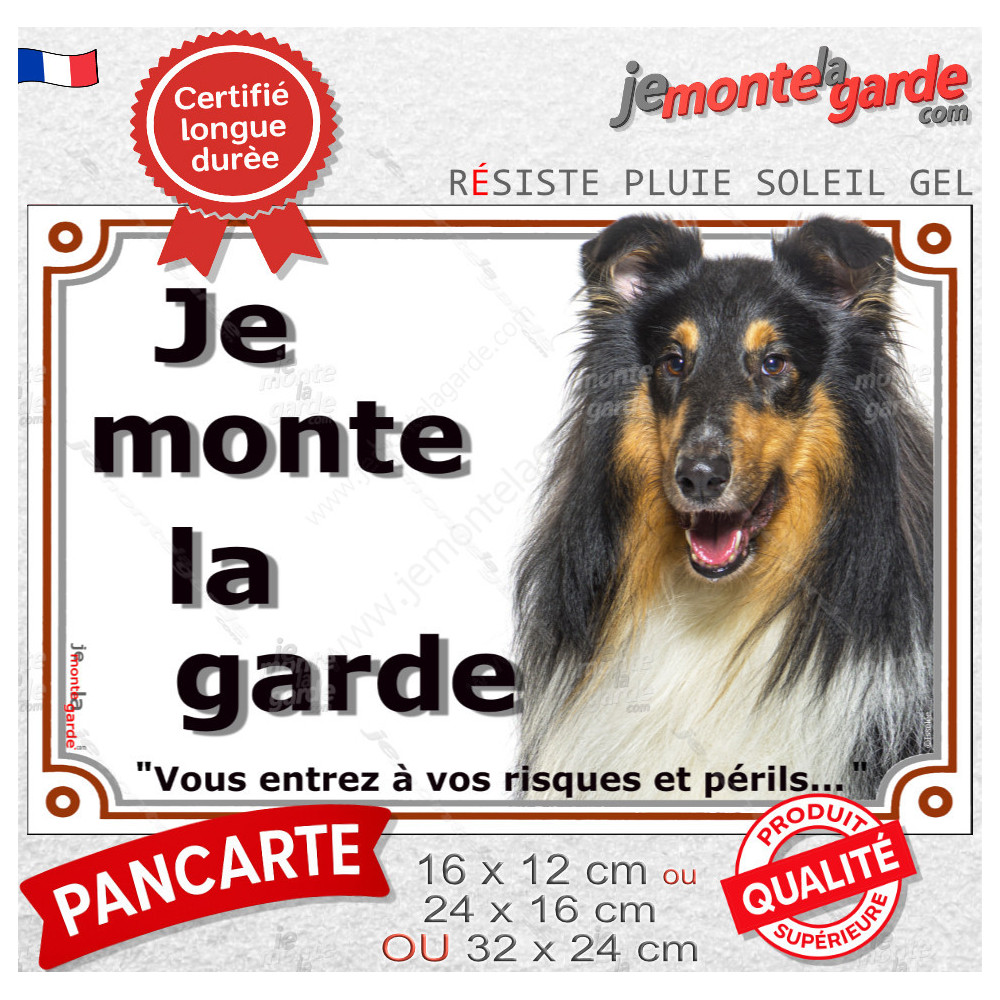 Plaque “Je monte la garde, vous entrez à vos risques et périls” avec photo du Colley tricolore, fabriquée en France. Résistante à la pluie, au soleil et au gel, elle assure sécurité et sérénité, tout en étant un cadeau original et pratique pour toute entrée.