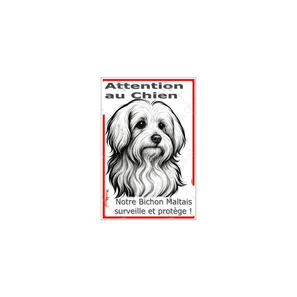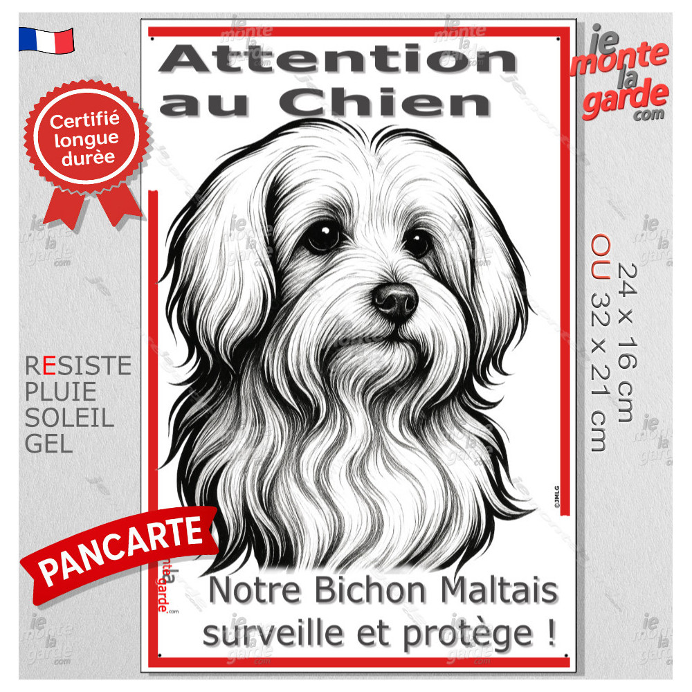 Plaque verticale “Attention au Chien, merci de ne pas entrer sans autorisation” avec silhouette d’un Bichon Maltais en noir et blanc stylisée. Idéale pour poteau ou portail étroit, résiste au soleil, à la pluie et au gel, dissuade les intrus, évite les fuites et gére les visiteurs avec respect et sécurité.