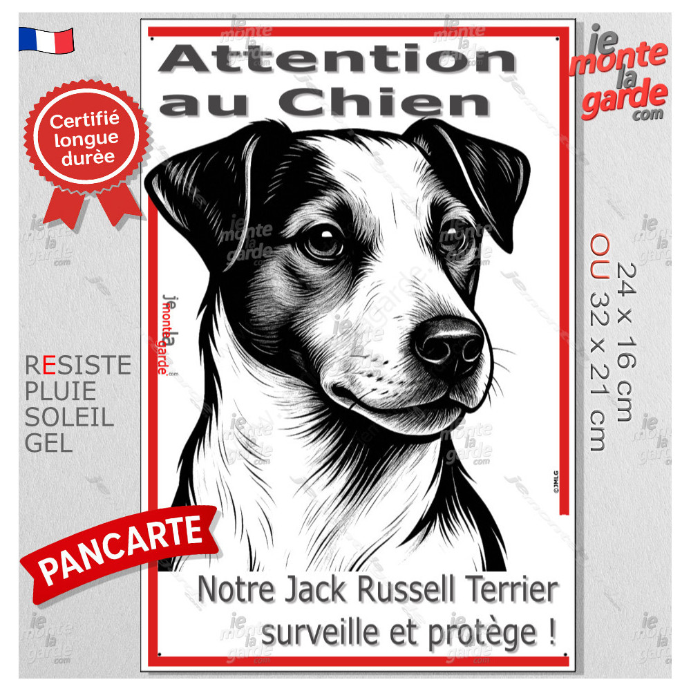 Plaque verticale “Attention au Chien, merci de ne pas entrer sans autorisation” avec dessin du Jack Russell Terrier en noir stylisé. Idéale pour poteau ou portail étroit, résiste au soleil, à la pluie et au gel, dissuade les intrus, évite les fuites et gére les visiteurs avec respect et sécurité.