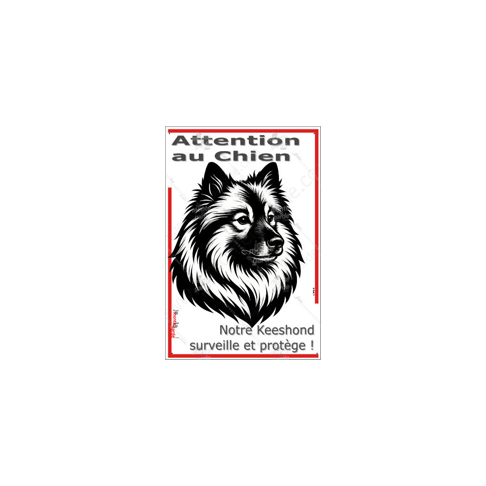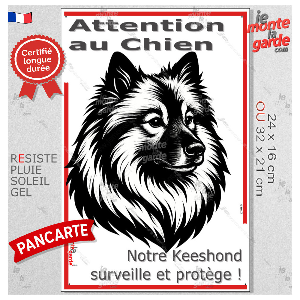 Plaque verticale “Attention au Chien, merci de ne pas entrer sans autorisation” avec silhouette d’un Keeshond, le Spitz-Loup, en noir et blanc stylisée. Idéale pour poteau ou portail étroit, résiste au soleil, à la pluie et au gel, dissuade les intrus, évite les fuites et gére les visiteurs avec respect et sécurité.