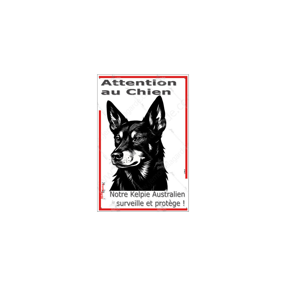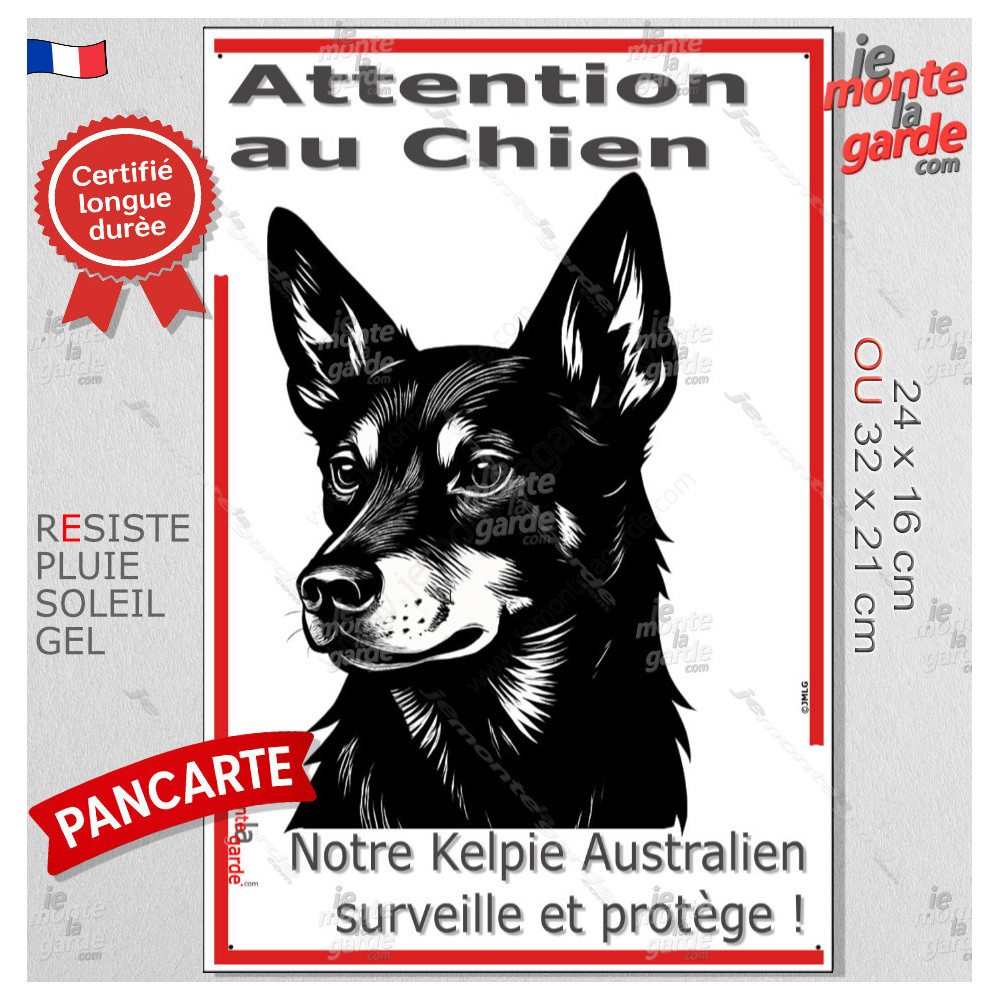 Plaque verticale “Attention au Chien, merci de ne pas entrer sans autorisation” avec silhouette d’un Kelpie Australien en noir et blanc stylisée. Idéale pour poteau ou portail étroit, résiste au soleil, à la pluie et au gel, dissuade les intrus, évite les fuites et gére les visiteurs avec respect et sécurité.