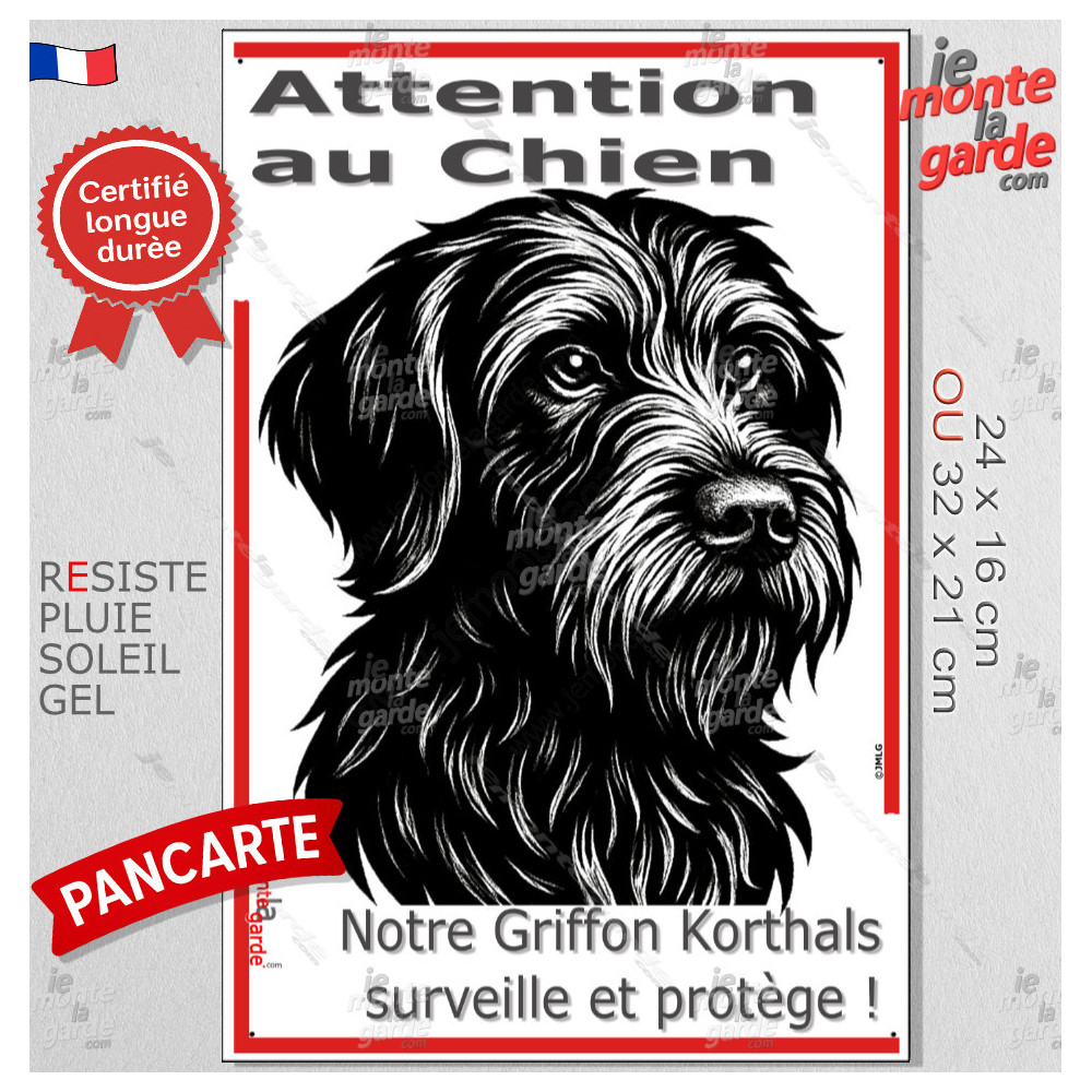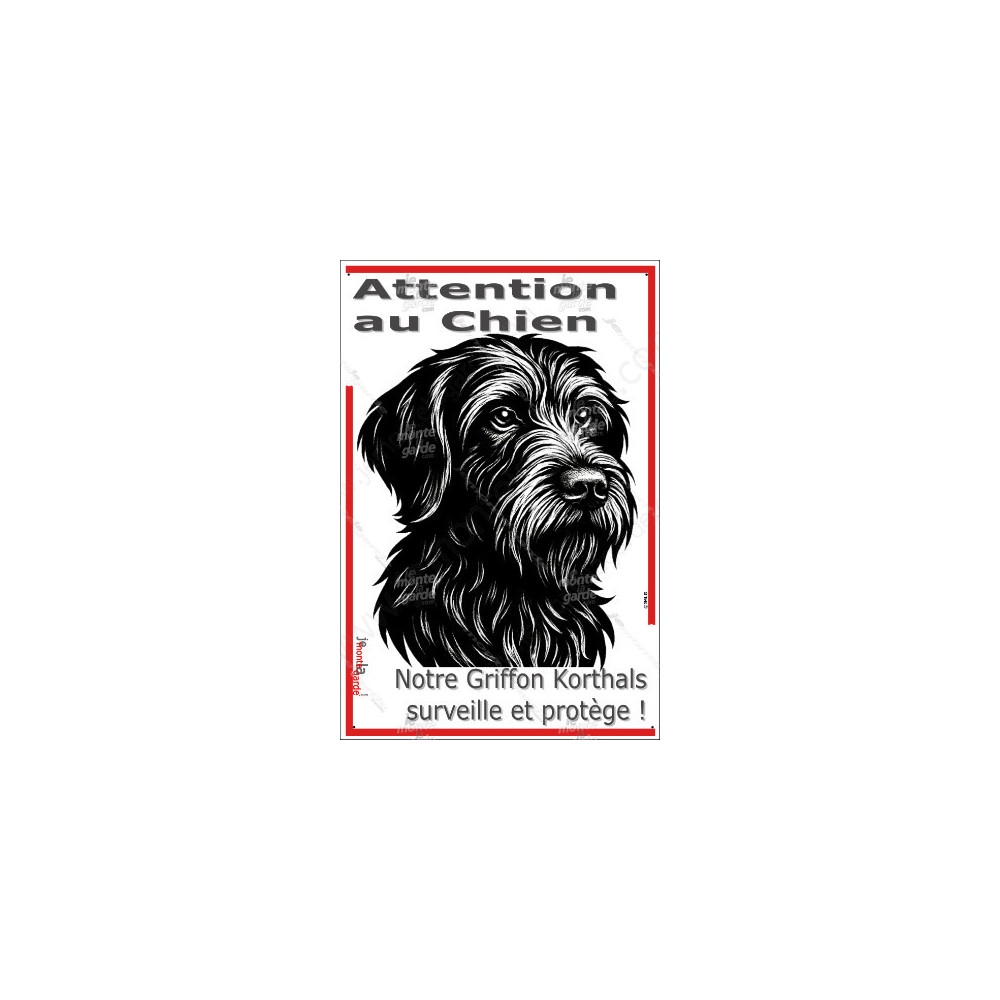 Plaque verticale “Attention au Chien, merci de ne pas entrer sans autorisation” avec silhouette d’un Griffon Korthals en noir et blanc stylisée. Idéale pour poteau ou portail étroit, résiste au soleil, à la pluie et au gel, dissuade les intrus, évite les fuites et gére les visiteurs avec respect et sécurité.