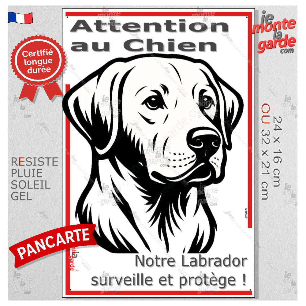 Plaque verticale “Attention au Chien, merci de ne pas entrer sans autorisation” avec silhouette d’un Labrador sable en noir et blanc stylisée. Idéale pour poteau ou portail étroit, résiste au soleil, à la pluie et au gel, dissuade les intrus, évite les fuites et gére les visiteurs avec respect et sécurité.