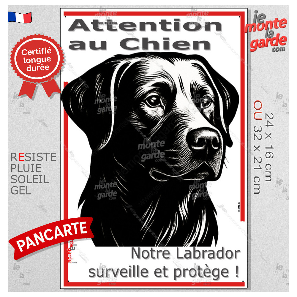 Plaque verticale “Attention au Chien, merci de ne pas entrer sans autorisation” avec silhouette d’un Labrador en noir et blanc stylisée. Idéale pour poteau ou portail étroit, résiste au soleil, à la pluie et au gel, dissuade les intrus, évite les fuites et gére les visiteurs avec respect et sécurité.