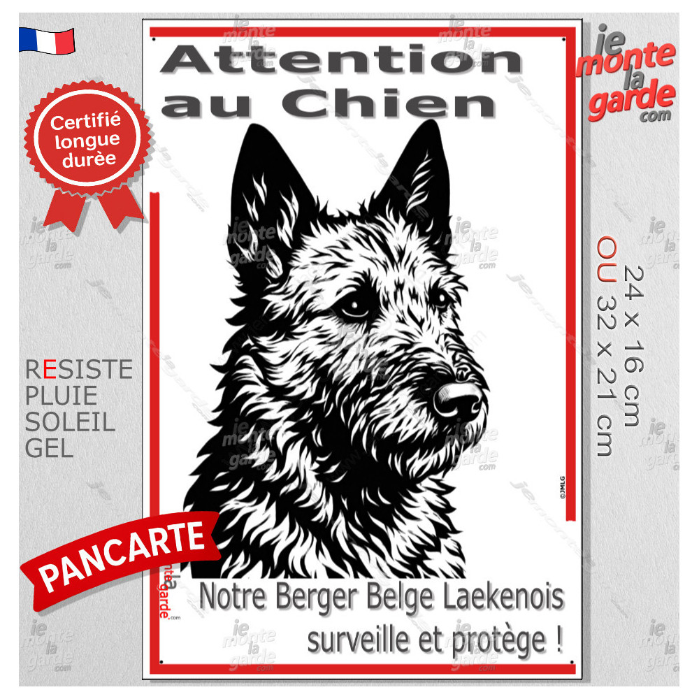 Plaque verticale “Attention au Chien, merci de ne pas entrer sans autorisation” avec silhouette d’un Berger Belge Laekenois en noir et blanc stylisée. Idéale pour poteau ou portail étroit, résiste au soleil, à la pluie et au gel, dissuade les intrus, évite les fuites et gére les visiteurs avec respect et sécurité.