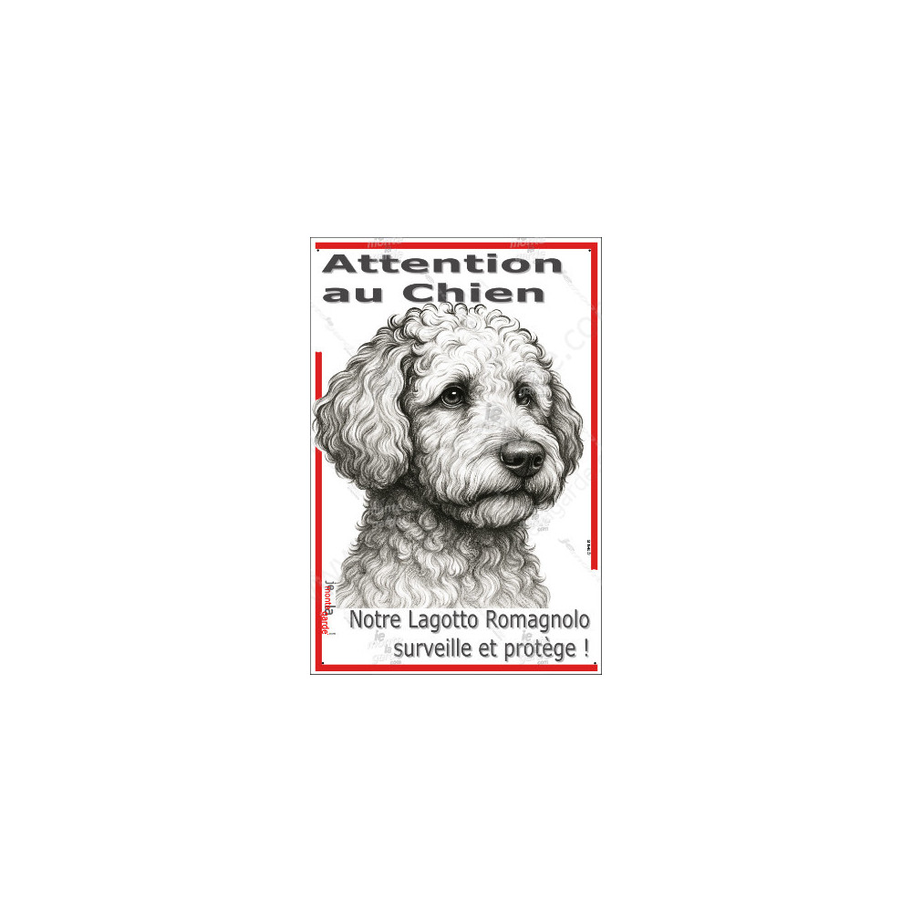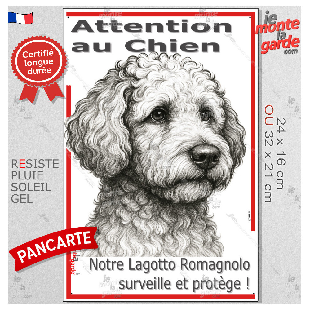 Plaque verticale “Attention au Chien, merci de ne pas entrer sans autorisation” avec silhouette d’un Lagotto Romagnolo, Chien d'Eau Romagnol, en noir stylisée. Pour poteau ou portail étroit, résiste au soleil, à la pluie et au gel, dissuade les intrus, évite les fugues et gére les visiteurs avec respect et sécurité.