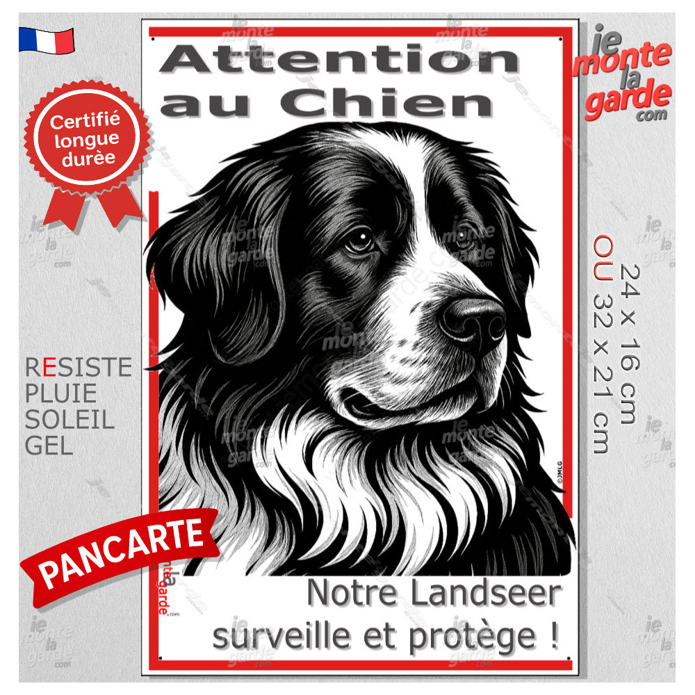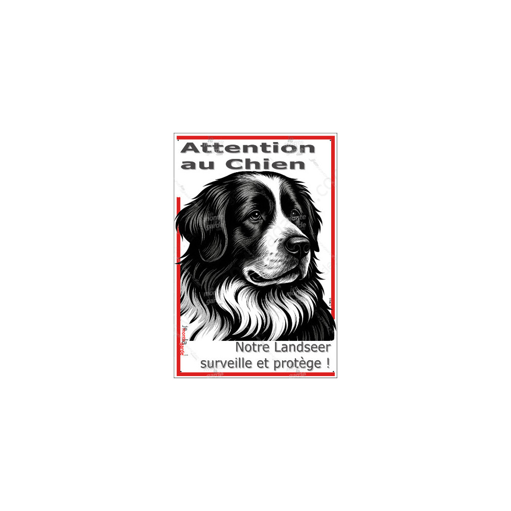 Plaque verticale “Attention au Chien, merci de ne pas entrer sans autorisation” avec silhouette d’un Landseer en noir et blanc stylisée. Idéale pour poteau ou portail étroit, résiste au soleil, à la pluie et au gel, dissuade les intrus, évite les fuites et gére les visiteurs avec respect et sécurité.
