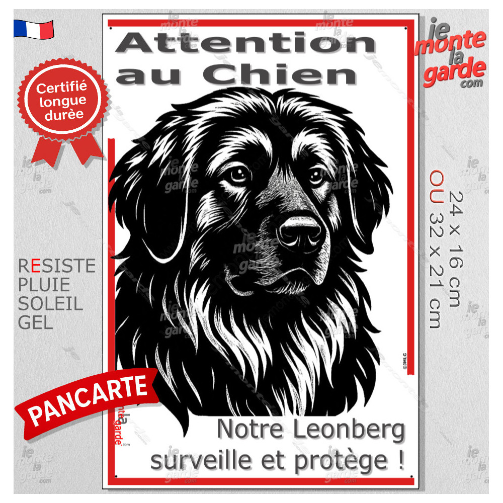 Plaque verticale “Attention au Chien, merci de ne pas entrer sans autorisation” avec silhouette d’un Leonberg, en noir et blanc stylisée. Idéale pour poteau ou portail étroit, résiste au soleil, à la pluie et au gel, dissuade les intrus, évite les fuites et gére les visiteurs avec respect et sécurité.