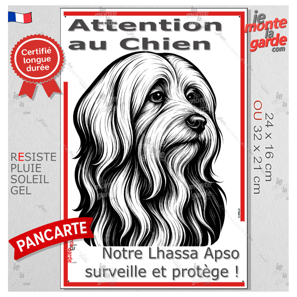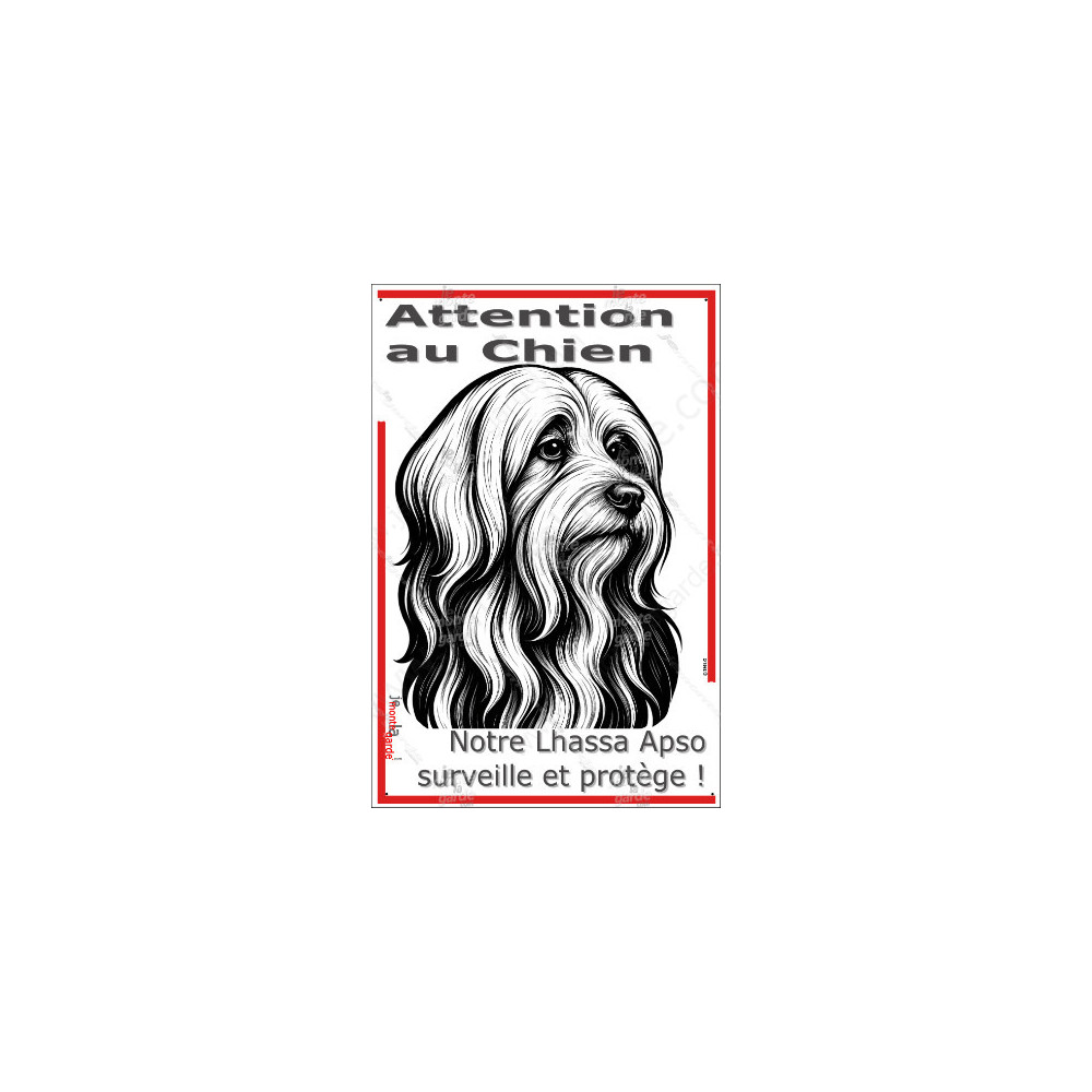 Plaque verticale “Attention au Chien, merci de ne pas entrer sans autorisation” avec silhouette d’un Lhassa Apso en noir et blanc stylisée. Idéale pour poteau ou portail étroit, résiste au soleil, à la pluie et au gel, dissuade les intrus, évite les fugues et guide les visiteurs avec respect et sécurité.
