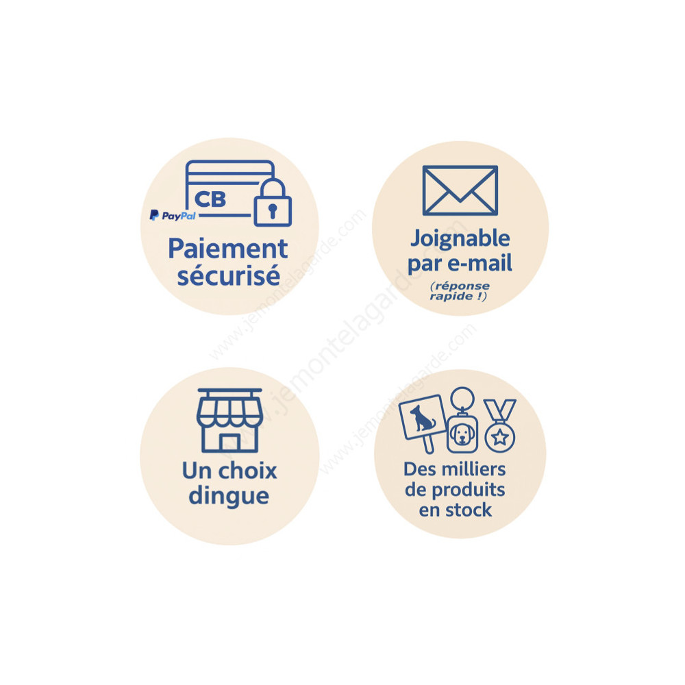 | Particularités : | Le logo filigrane (copyright) n'apparaît pas sur le produit réel - La photo est susceptible de légères variations de taille, de nuances de couleur, ou de posture du chien - La taille du produit peut varier de quelques millimètres (produit artisanal) |