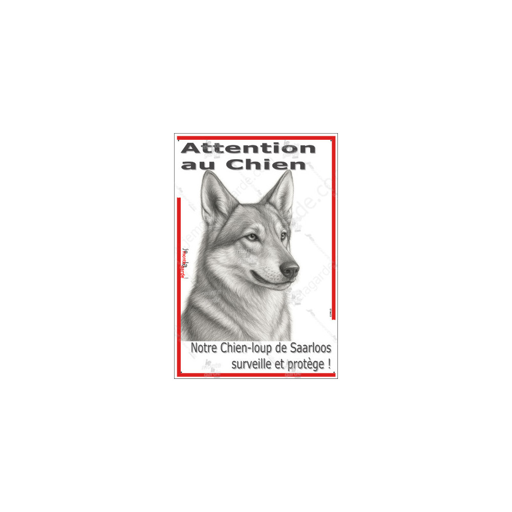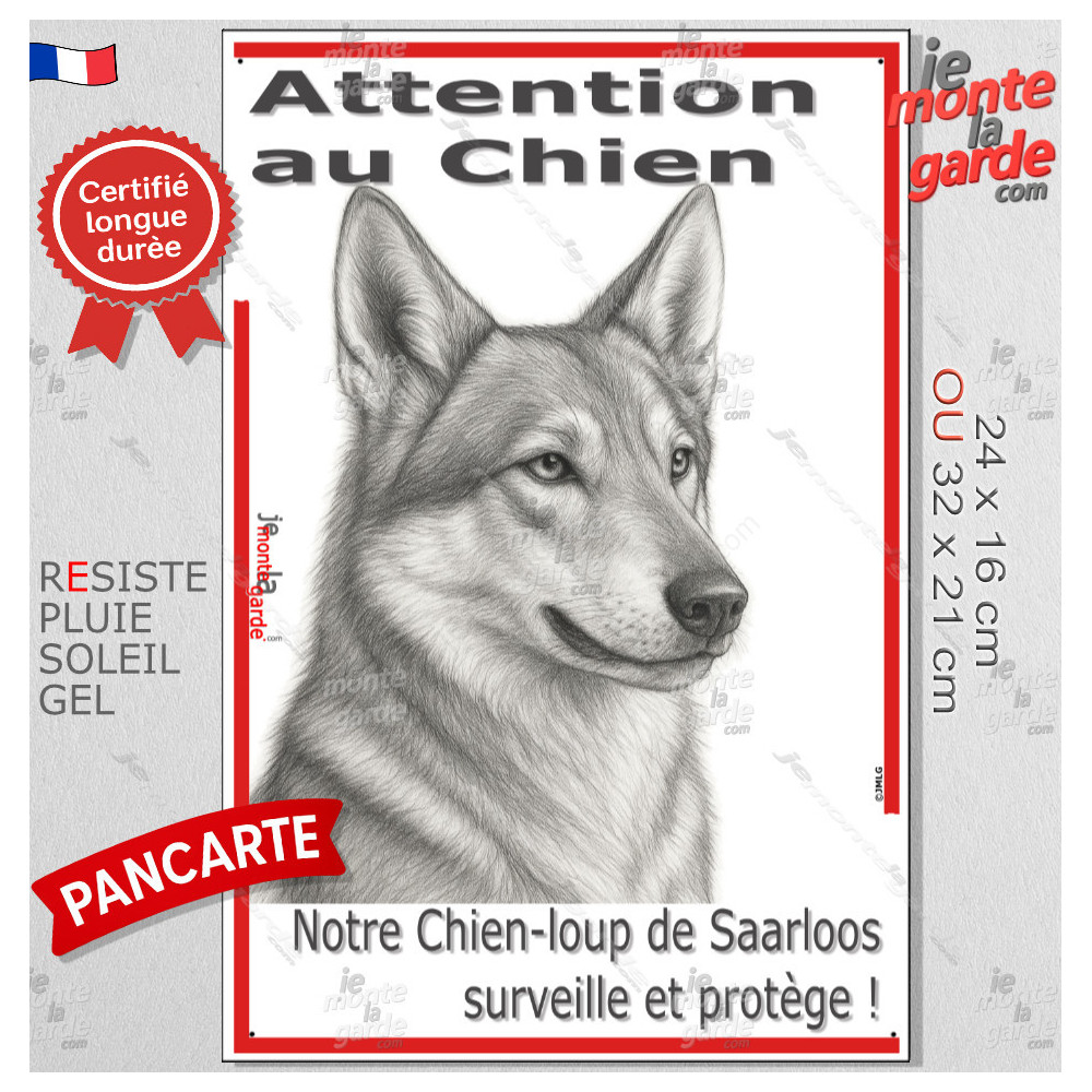 Plaque verticale “Attention au Chien, merci de ne pas entrer sans autorisation” avec silhouette d’un Chien-Loup de Saarloos en noir et blanc stylisée. Idéale pour poteau ou portail étroit, résiste au soleil, à la pluie et au gel, dissuade les intrus, évite les fugues et guide les visiteurs avec respect et sécurité.