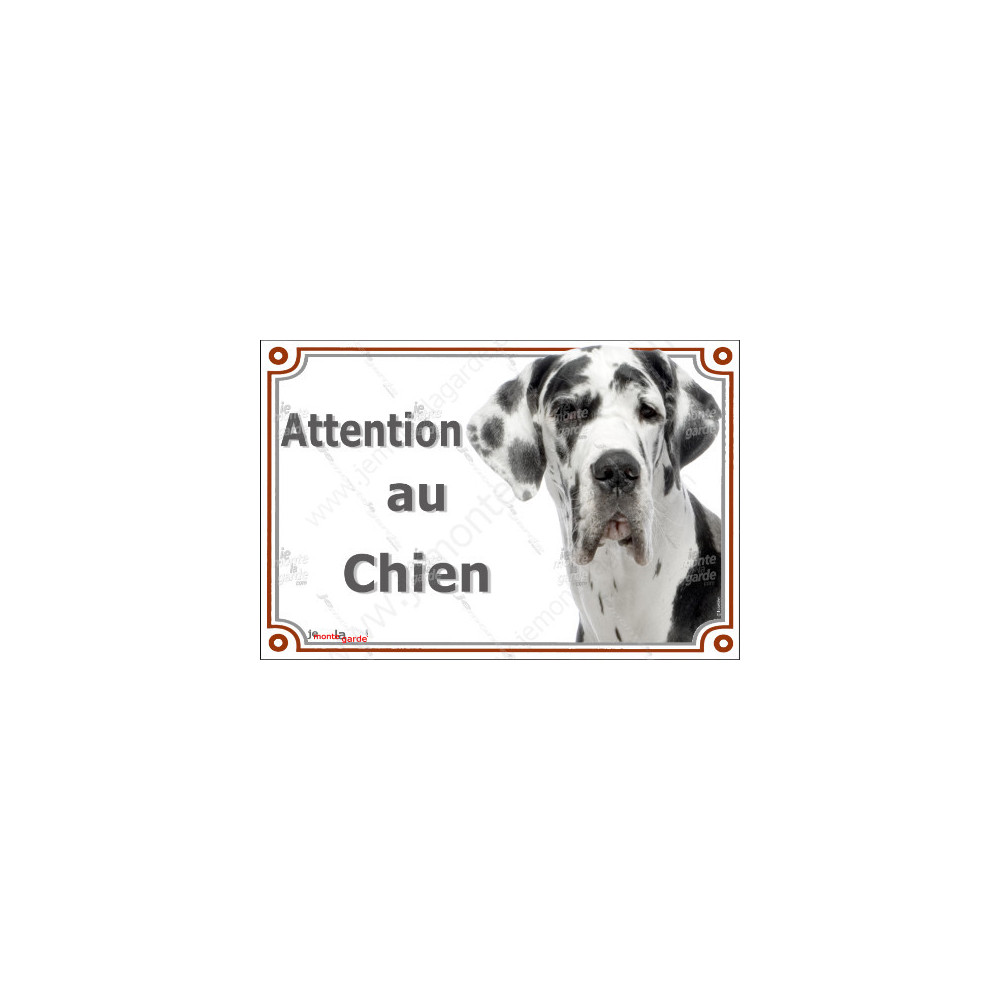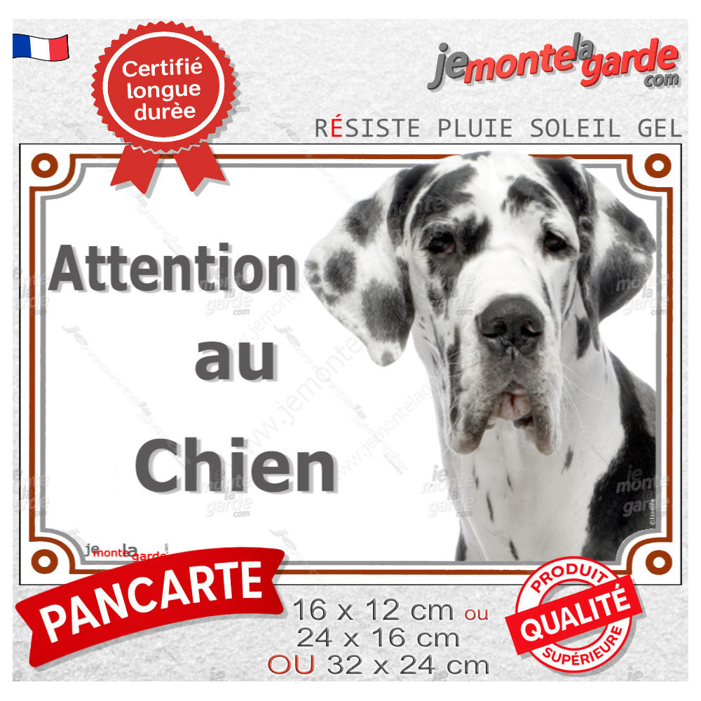 Cette plaque "Attention au Chien" avec un Dogue Allemand Arlequin, blanc avec des taches noires, résistante aux intempéries, dissuade subtilement les visiteurs. Fabriquée en France, elle protège efficacement tout en étant un cadeau idéal pour les fans de cette race.