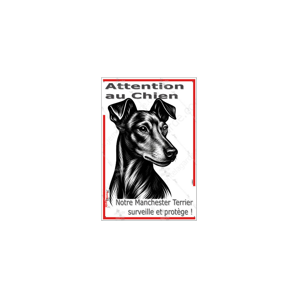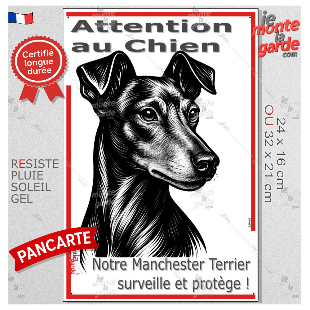 Plaque verticale “Attention au Chien, merci de ne pas entrer sans autorisation” avec silhouette d’un Manchester Terrier en noir et blanc stylisée. Idéale pour poteau ou portail étroit, résiste au soleil, à la pluie et au gel, dissuade les intrus, évite les fugues et guide les visiteurs avec respect et sécurité.