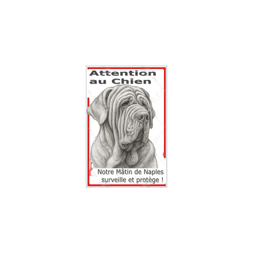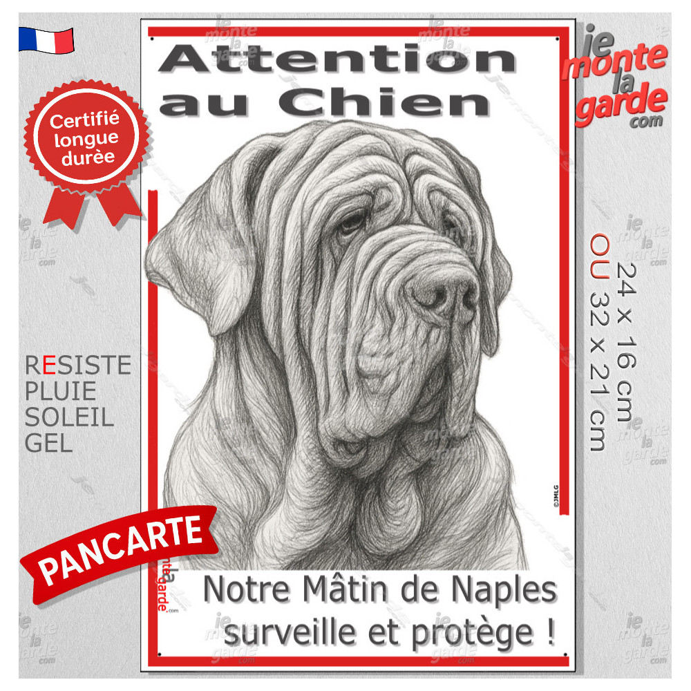 Plaque verticale “Attention au Chien, merci de ne pas entrer sans autorisation” avec silhouette d’un Mâtin de Naples en noir et blanc stylisée. Idéale pour poteau ou portail étroit, résiste au soleil, à la pluie et au gel, dissuade les intrus, évite les fugues et guide les visiteurs avec respect et sécurité.