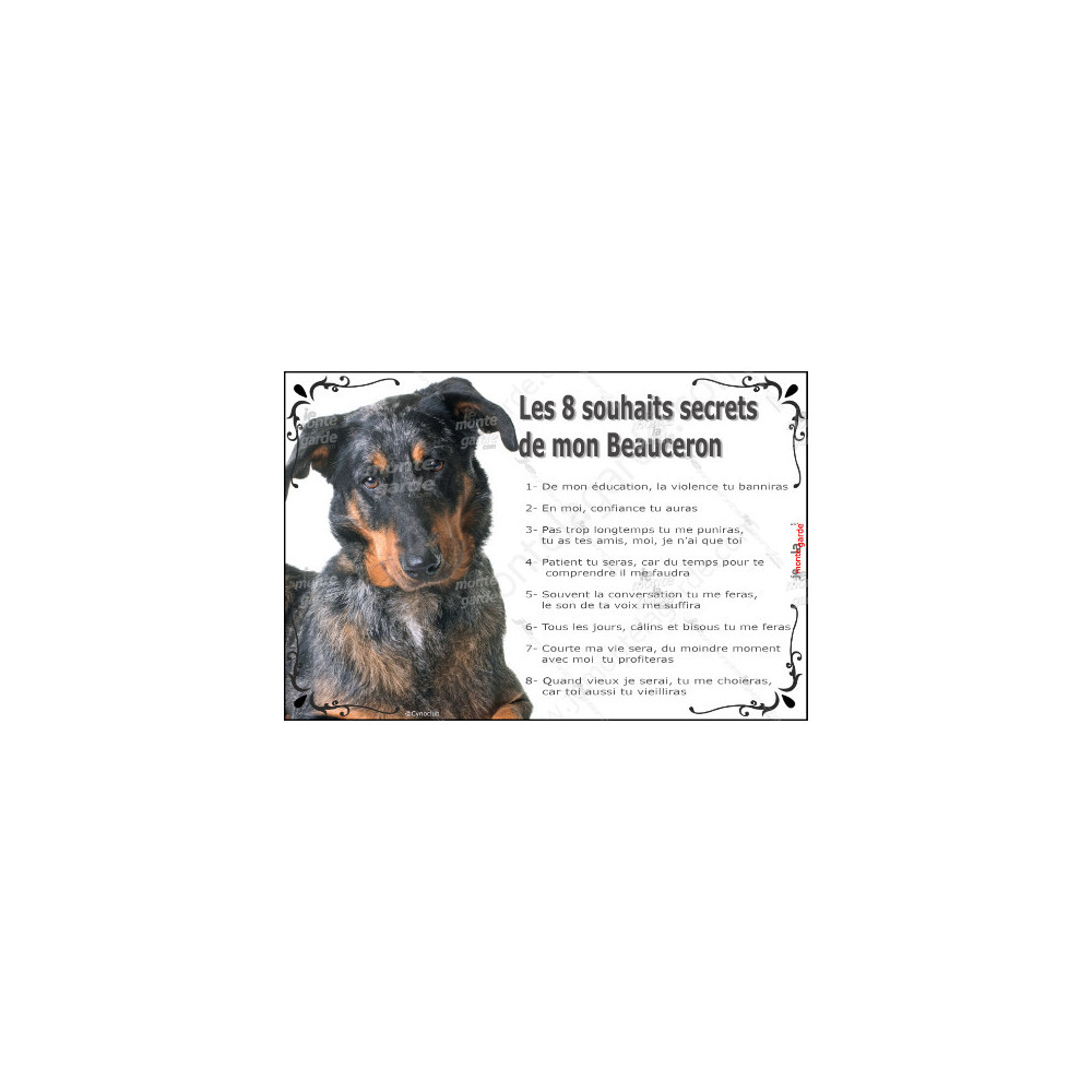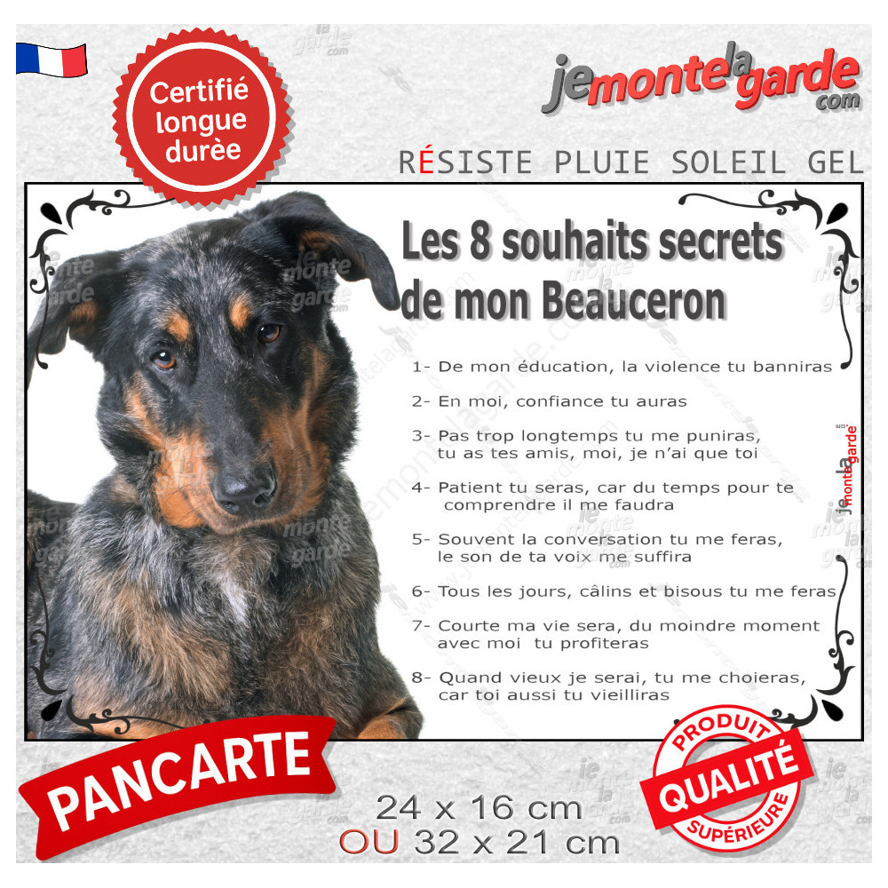 Pancarte “Les 8 souhaits secrets de mon Beauceron”, résiste pluie, soleil et gel. Durable, lisible d’un coup d’œil. 2 formats disponibles pour s’adapter à tout espace : petit ou grand portail, intérieur ou abri. Hommage émouvant au Berger de Beauce arlequin, race française au caractère loyal et sensible.