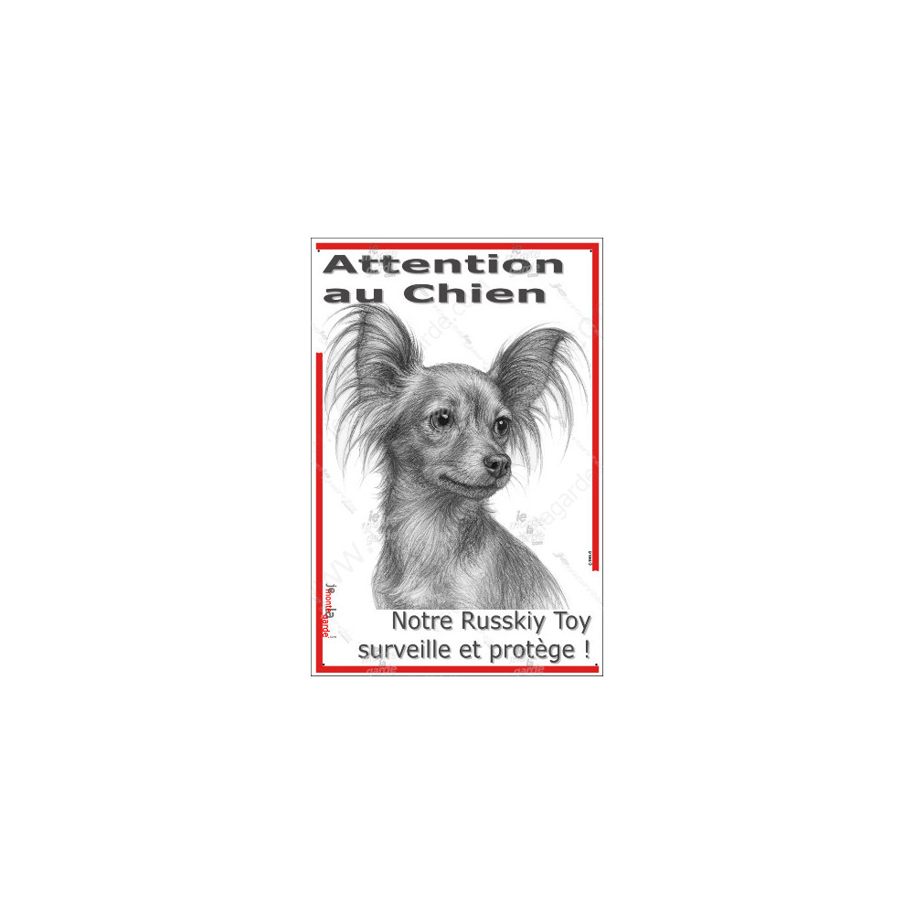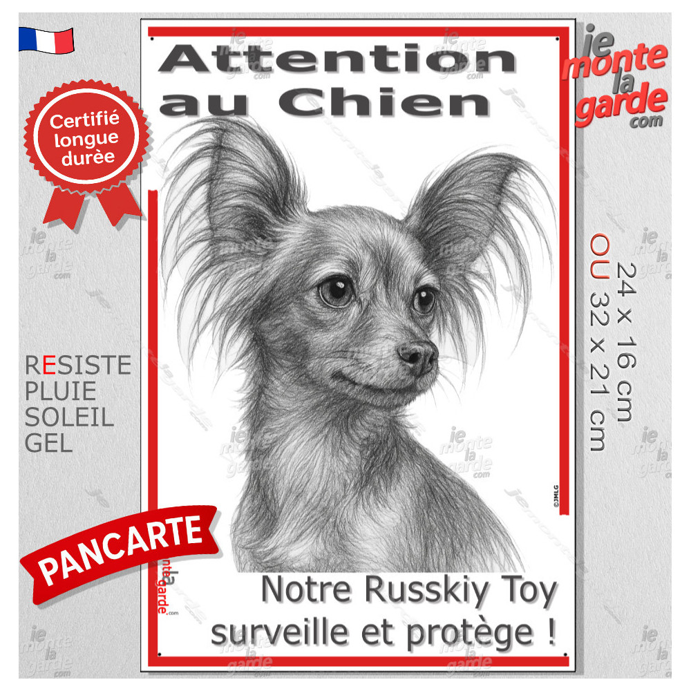 Plaque verticale “Attention au Chien, merci de ne pas entrer sans autorisation” avec dessin stylisé d’un Russkiy Toy, le Petit Chien Russe. Idéale pour poteau ou portail étroit, résiste au soleil, à la pluie et au gel, dissuade les intrus, évite les fugues et guide les visiteurs avec respect et sécurité.