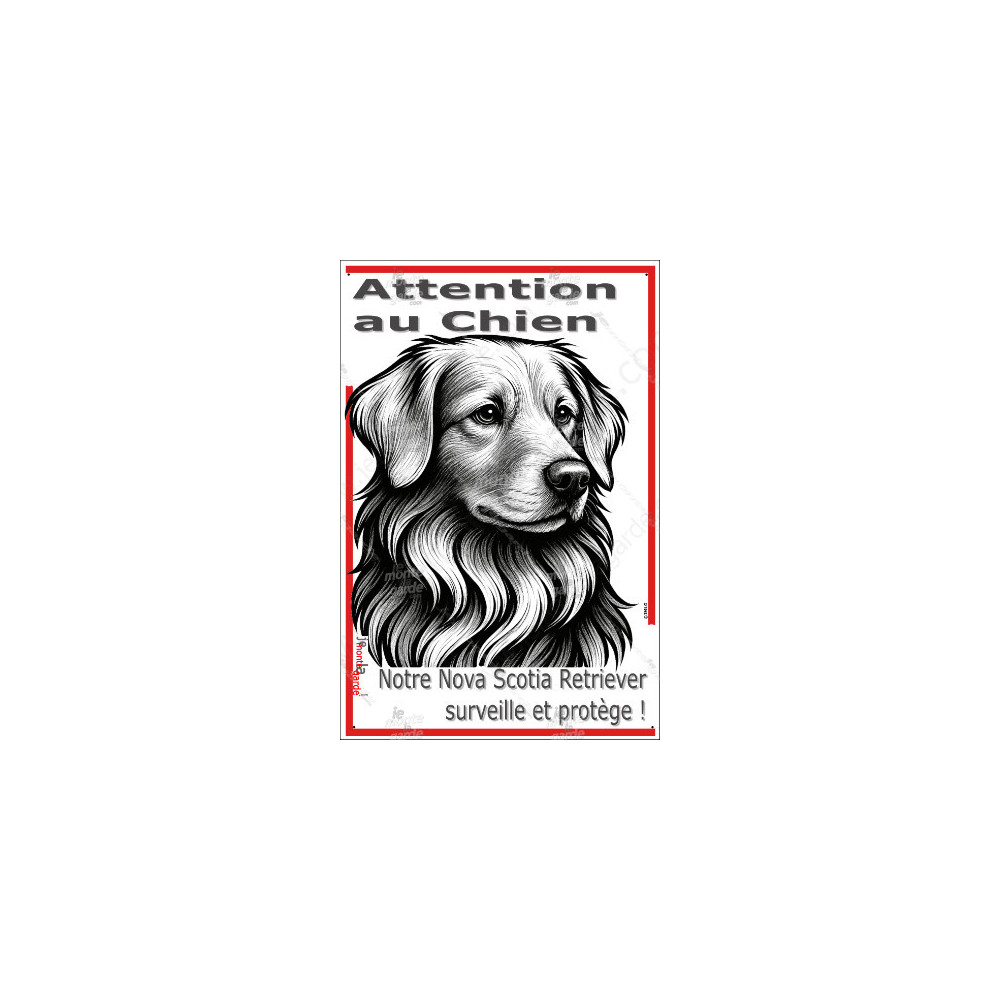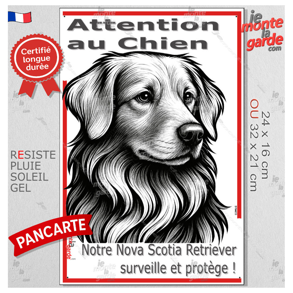 Plaque verticale “Attention au Chien, merci de ne pas entrer sans autorisation” avec dessin stylisé d’un Nova Scotia Retriever. Idéale pour poteau ou portail étroit, résiste au soleil, à la pluie et au gel, dissuade les intrus, évite les fugues et guide les visiteurs avec respect et sécurité.