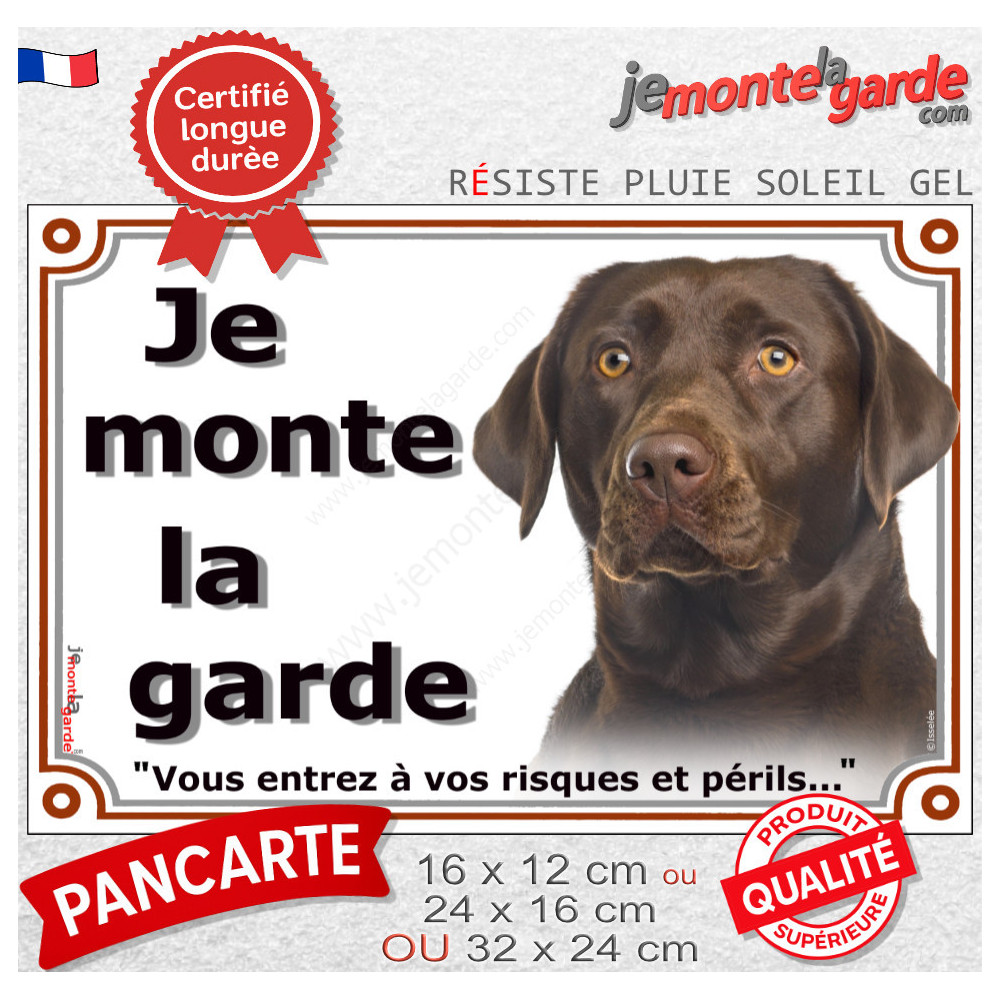 Pancarte "Je monte la garde, vous entrez à vos risques et périls" avec la photo d'un Labrador Retriever marron chocolat, fabriquée en France. Résistante aux intempéries, elle assure une sécurité durable tout en apportant du charme à votre portail. Un cadeau pratique et élégant pour tout propriétaire vigilant.