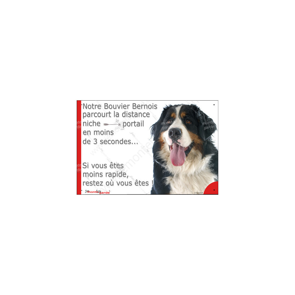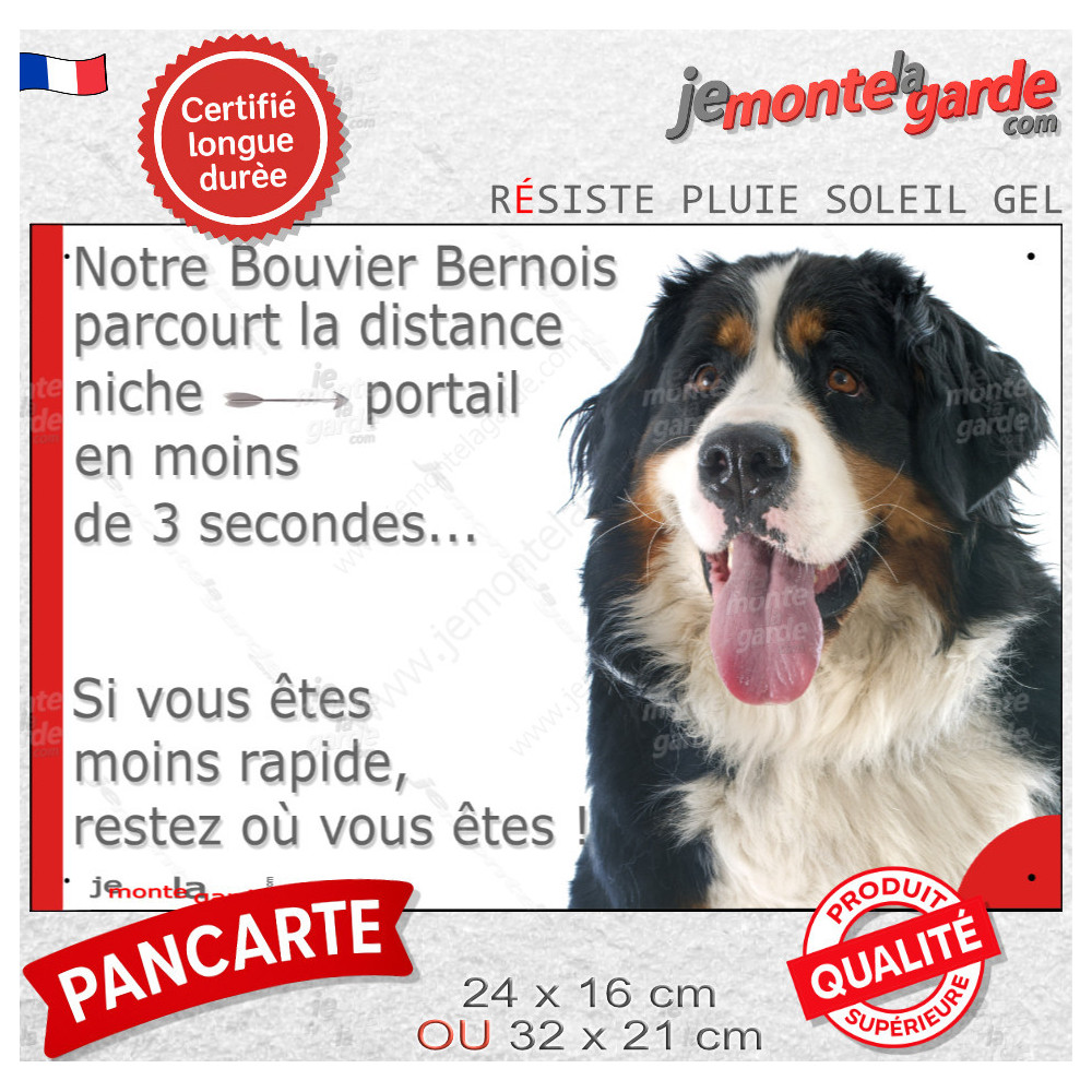 Plaque de portail drôle avec la photo d’un Bouvier Bernois et le texte “Notre Bouvier Bernois parcourt la distance niche-portail en moins de 3 secondes… Si vous êtes moins rapide, restez où vous êtes !”. Résistante au gel, pluie, soleil. Fabrication française, design clair et percutant.